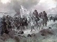 In Ramillies the Allied infantry, now reinforced by the English troops brought down from the north, at last broke through. The Régiment de Picardie stood their ground but were caught between Colonel Borthwick's Scots-Dutch regiment and the English reinforcements. Borthwick was killed, as was Charles O’Brien, the Irish Viscount Clare in French service, fighting at the head of his regiment.[72] The Marquis de Maffei attempted one last stand with his Bavarian and Cologne Guards, but it proved in vain. Noticing a rush of horsemen fast approaching from the south, he later recalled: "... I went towards the nearest of these squadrons to instruct their officer, but instead of being listened to [I] was immediately surrounded and called upon to ask for quarter."[73]