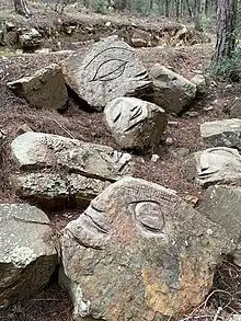 Opposite the statues on the other side of the road, is where he is said to live. Deodato Inácio Santos is also known for his lesser-known work in the Forest, where he has carved faces into the stones along the path, which is a part of the larger "Walk of Poets", a more recent creation from 2021. Santos has carved poetry and quotes into rock faces along one of the paths going through the forest.[13]