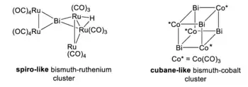 Multiple bismuth-containing clusters were reported, some of them synthesized through carbon monoxide ligand loss from the previously reported bismuth complexes.[2] Strained cluster complexes with monodentate as well as bridging carbon monoxide units have also been isolated, such as [{Cp(μ2-CO)Fe}3(μ3-Bi)] and [(µ3-Bi)Co3(CO)6(µ-CO)3].[13]