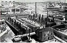 By 1874 there were 123 refineries in what would become known as "Black City".[4] The refinery district was about 8 miles (13 km) from the shipping ports.[5] An industrial area plan was completed in 1876. Some of the farms and pastures of the neighbouring village of Keshla were zoned to accommodate replacements for factories that had been dismantled in the city. The new industrial zone was 2 kilometres (1.2 mi) from residential areas. To prevent further pollution, the new zoning law prohibited oil refineries from being built within the residential area.[3] By 1880, there were 118 industrial businesses functioning in the Black City area.[3]