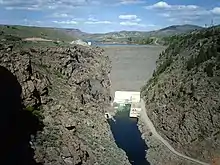 The centerpiece of the plans for the Gunnison was the construction of four dams on a 40-mile stretch (64 km) of the river east of the National Park Service's Black Canyon of the Gunnison National Park, projects that would not only help control the amount of water flowing into the Colorado, but would also create new opportunities for flood control, water storage, and the generation of hydroelectric power.[4] The first of these dams was Blue Mesa Dam, which was begun in 1962 approximately 30 miles (48 km) west of Gunnison, and 1.5 miles (2.4 km) west of Sapinero. Finished four years later, the dam created Blue Mesa Reservoir, which became the primary water storage reservoir for the Curecanti Unit (later renamed the Wayne N. Aspinall Unit).[5]