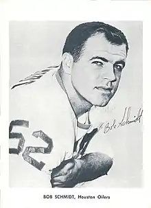 Robert Malcolm Schmidt (born July 9, 1936), nicknamed "Two Bud", is an American former professional football player who was a center in the National Football League (NFL) and American Football League (AFL). Schmidt played college football for the Minnesota Golden Gophers and professionally between 1959 and 1967. He started with the NFL's New York Giants and then moved to the new AFL's Houston Oilers in 1961. He was a member of the Oilers' American Football League Championship team in 1961, and was an AFL All-Star in 1961, 1962, and 1963. He finished his professional football career in 1967 with the AFL's Buffalo Bills.
