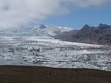 Breiðamerkurjökull (Icelandic pronunciation: [ˈpreiːðaˌmɛr̥kʏrˌjœːkʏtl̥] ) is an outlet glacier of the larger glacier of Vatnajökull and a piedmont glacier in the southern part of Vatnajökull National Park, Iceland. Emerging as a tongue of the Vatnajökull, it ends in a small lagoon, known as Jökulsárlón. Over time, it has gradually been breaking down.[1][2]