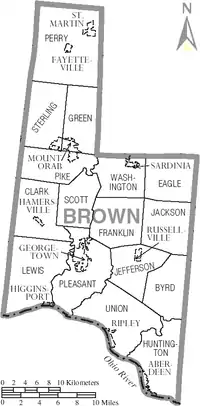 Brown County is a county in the U.S. state of Ohio. As of the 2020 United States Census, the population was 43,676.[1] The county seat and largest city is Georgetown.[2] The county was created in 1818[3] and is named for Major General Jacob Brown, an officer in the War of 1812 who was wounded at the Battle of Lundy's Lane.[4] Brown County is part of the Cincinnati-Middletown, OH-KY-IN Metropolitan Statistical Area.