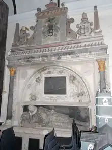 The Domesday Book of 1086 lists Bochewis as the 2nd of the 27 Devonshire holdings of Theobald FitzBerner (fl.1086),[3] one of the Devon Domesday Book tenants-in-chief of King William the Conqueror. He held it in-demesne. Before the Norman Conquest of 1066 it had been held jointly by three Anglo-Saxon thanes.[11] The ancient manor is today represented by Bucks Mills and Bucks Cross.[12] During the reign of King Edward I (1272-1307) the manor of Bucks, together with Wallen (later Wallen Cary, held by the Cary family, lords of the nearby Manor of Clovelly), was held by Henry de Wallen. During the reign of King Edward II (1307-1327) Stephen de Wallen granted to Robert Stockey and his heirs that their tenement of Potesford and Bulkworthy should have a right-of-way for ever upon his land of Bokish and Wallen, for the purposes of carrying "sea-oar" (some type of mineral ore) and sand from the sea "with all carriages whatsoever", which deed was witnessed by Matthew Crawthorne, Joel Pollard, Gilbert Wibbery and Walter Beaple.[4] The manor was later acquired by means unknown by the Cole family of Slade in the parish of Cornworthy in Devon, a branch of Cole of Nethway[13] in the parish of Brixham in Devon, one of whom was John Cole (born c.1376), twice a Member of Parliament for Devon, in 1417 and 1423 and Sheriff of Devon 1405–6.[14] The last of the Coles of Bucks was Richard Cole (1568-1614), also of Slade, who died without progeny and whose large and elaborate monument with effigy dressed in armour survives in All Hallows Church, Woolsfardisworthy. His near contemporary the Devonshire historian Risdon (d.1640) (whose grandfather lived nearby at Bableigh, Parkham[15]) stated of him: "Richard Cole, the last of that family that dwelt at Bokish, erected a harbour in his land, there to shelter ships and boats".[1] This is now known as the Old Quay at Bucks Mills,[16] This structure was built after he had blasted out the rock with gunpowder to leave a sandy inlet known as "The Gut" or "Gutway".[17] Remains of the quay are visible at low-tide.[18]