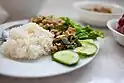 The Khmer term samlor (សម្ល) has a broad range of meanings and can be used to refer to a wide variety of stews and curries. Curries are a staple food in Cambodian cuisine and are usually eaten with rice, fresh noodles, or a baguette. They usually include seafood, chicken, beef, and pork, and vegetarian Cambodian curries are uncommon. Popular Cambodian curries are fish amok, num banhchok, kari sach moan, sour beef curry and curry leaf chicken.[87] The word kari (ការី, kari) is used to designate an Indian type of curry and is believed to be a loanword from Tamil.[88] Curries are served on all important ceremonial occasions. Cambodian curries are distinct from the rest of Asia by their use of sweet potatoes.[89]