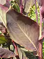 Canna 'Roi Humbert' is an Italian Group canna cultivar; bronze foliage, ovoid shaped, spreading habit; oval stems, coloured purple; flowers are cupped, self-coloured scarlet, staminodes are large, edges ruffled, fully self-cleaning; seed is sterile, pollen is sterile; rhizomes are thick, up to 3 cm in diameter, coloured purple; tillering is average. Introduced by C. Sprenger, Dammann & Co, Naples, Italy, EU in 1908.