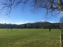 Shinty Pitch at Cannich. Nissen Hut visible behind goals.