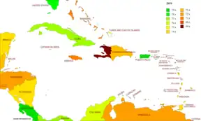 Geopolitically, the islands of the Caribbean are often regarded as a subregion of North America, though sometimes they are included in Middle America or left as a subregion of their own[9][10] and are organized into 33 political entities, including 13 sovereign states, 12 dependencies, one disputed territory, and seven other overseas territories. From December 15, 1954, to October 10, 2010, there was a territory known as the Netherlands Antilles composed of five islands, all of which were Dutch dependencies.[11] From January 3, 1958, to May 31, 1962, there was also a short-lived political union called the West Indies Federation composed of ten English-speaking Caribbean territories, all of which were then British dependencies.
