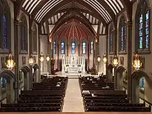 The cathedral was completed in a mixed Tudor-Gothic style: the exposed wooden beams inside the church are typical of the Tudor style, while the pointed arches of the windows and doorways evince a Gothic influence.[1] Three of the large windows inside the church were executed by the stained-glass artist Emil Frei, Jr.[1]
