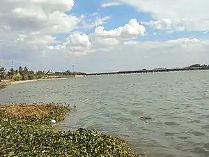 A train cruises over Kaveri river next to the station near Pallipalayam, Tamil Nadu