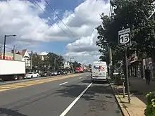 US 13 northbound approaching the turn from 38th Street to Powelton Avenue in West Philadelphia