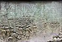 On two sides of the statue has mural type of stone carving depicting the POW inaugurating the museum