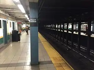 Each platform was re-tiled during a 1997 renovation with a reproduction of its original 1920 Dual Contracts era tiling. The name tablets contain "CHURCH AVE" in serif font on a blue background and green border. The station's trim line consists of light brown color with a mostly green border and "C" tablets (for "Church") at regular intervals.