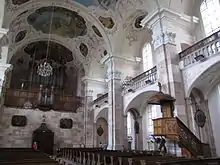 Saint Maurice served as the abbey church of a now defunct Benedictine monastery, founded in the 7th century and belonging to the oldest in Alsace.[3] The relatively plain exterior of the building, construction of which was started in the late 17th century to replace a much older predecessor, is related in its rectangular floor plan to a medieval form of architectural language and indicates nothing of the richness of the interior design and furnishing. These are largely the work of Tyrolean artists: the ceiling paintings (1730–1733), with depictions of the legends of Maurice and of Benedict are by Josef Mattes (nave) and Joseph Mages (chorus, transept, crossing); the choir and confessionals were also made by Tyrolians. Some Alsatians and Germans were however involved in the design of the bright and colorful interior: The expressive Samson pulpit (see also St. George's Church, Sélestat) is a work by Clemens Winterhalder and the mighty main altar (1728) one by Jean-Léonard Meyer from Sélestat The other altars are works by Anton von Wihl, from Sélestat, and Anton Ketterer, from Colmar.