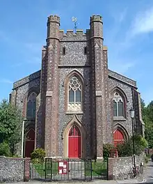 The new church was designed by George Cheesman in the Early English style, to include a rectangular aisled nave with no arcading, a short chancel, and a short embattled tower with castellated octagonal turrets, and constructed in knapped flint with red brick dressings.[12][13] An apse was a later addition.[14] Because of the limitations of the site, it was built on a north–south rather than the usual east–west orientation, and lies to the south of the original building.[10] It has large lancet windows with what Nikolaus Pevsner describes as "ignorant" tracery, and (again according to Pevsner) a "good, solid barn roof with tie-beams".[13] The tower, placed centrally at the ceremonial west end of the church, projects forward of the front wall,[1] and contains three 18th-century bells by John Waylett, one of which was re-cast in 1886.[4][15]