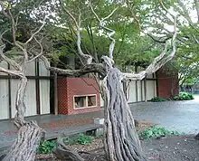 Mayhew designed two alumni houses for local colleges. The Reinhardt Alumnae House was completed in 1949 for Mills College, and the Alumni House was finished in 1953 for the University of California, Berkeley. The latter structure, made for US$375,000[13] out of stone, brick, steel and glass[14] and organized into two wings in the International style,[15] was mentioned twice in Progressive Architecture, receiving notice in the Progressive Architecture Annual Design Survey for 1954 (Education).[16]