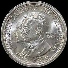 - ↑ The transition from protectorate to commonwealth, which occurred November 15, 1935, was commemorated on a set of three coins dated 1936-M. The fifty-centavo piece shows facing portraits of outgoing Governor-General Frank Murphy and incoming President Manuel Quezon. They are portrayed again on one of the peso coins, this time in profile, their busts overlapping. This same configuration is used for the other one-peso commemorative, but on its obverse the subjects are President Quezon and President of the United States Franklin D. Roosevelt. This is a very rare instance of a living U. S. president appearing on a United States coin. The common reverse for all three coins depicted the arms of the Commonwealth of the Philippines. Featuring elements symbolic of Spain, The USA and the islands themselves, it was adopted as the common reverse for all regular-issue coins beginning in 1937.