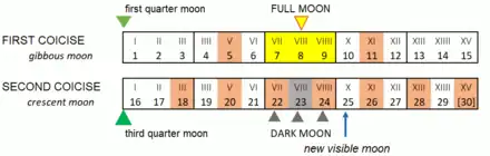 The Coligny calendar is designed to keep perfectly in sync with the lunar phase,[lower-alpha 3] with a tolerance of less than 24 hours.[12] Its internal notations are organised according to the phase of the moon.