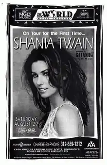 The Come On Over Tour was the debut concert tour by Canadian singer-songwriter Shania Twain. Visiting North America, Australia and Europe, the tour supported of her third studio album Come On Over (1997).[4] Deemed one of the most anticipated tours of the 1990s, the trek became the highest-grossing tour by a female country artist at the time.[5][6] The tour was seen by over two million spectators and earned over 80 million dollars.[7][8] Additional accolades include being named the "Country Tour of the Year" in 1998 and 1999 by Pollstar Concert Industry Awards.[9][10] Supporting Twain on the tour was family band Leahy and country artist Shane Minor. The tour was sponsored by Gitano Jeans.