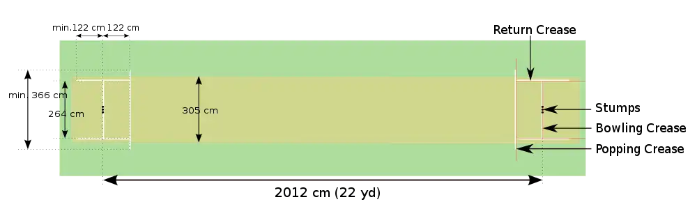In the approximate centre of the field is a rectangular pitch (see image, below) on which a wooden target called a wicket is sited at each end; the wickets are placed 22 yards (20 m) apart.[66] The pitch is a flat surface 10 feet (3.0 m) wide, with very short grass that tends to be worn away as the game progresses (cricket can also be played on artificial surfaces, notably matting). Each wicket is made of three wooden stumps topped by two bails.[67]