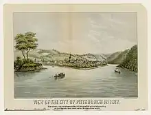 A view of the City of Pittsburgh in 1817, taken from a sketch by E. C. Gibson, is part of the Pittsburgh Prints Collection of D-Scribe's Historic Pittsburgh collection