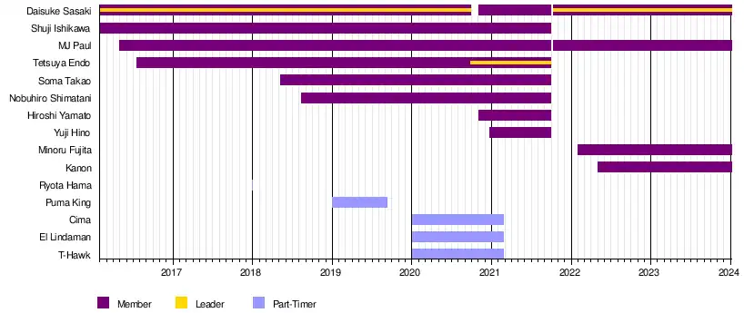 Various members of the unit are known to have made sporadic appearances in other promotions. On June 13, 2017, Ishikawa and Endo teamed up to defeat Nextream (Kento Miyahara and Yuma Aoyagi) on the second night of the Dynamite Series 2017, an event promoted by All Japan Pro Wrestling (AJPW).[37] At Machida Pro-Wrestling Festival Vol. 1, a freelance show promoted by the Japanese independent scene on September 8, 2017, Sasaki and Endo represented the unit as the defeated the team of Speed Of Sounds (Hercules Senga and Tsutomu Oosugi) in a tag team match, as well as Ishikawa teaming up with Masashi Takeda to pick up a victory over Big Japan Pro Wrestling's Daisuke Sekimoto and Yuko Miyamoto.[38] At Great Voyage in Yokohama Vol. 2, an event promoted by Pro Wrestling Noah on December 16, 2018, Nobuhiro Shimatani, who represented the stable, teamed up with Kazusada Higuchi and Kota Umeda in a losing effort to Atsushi Kotoge, Kenoh and Masa Kitamiya.[39] On May 4, 2019, at Mercury Rising, an event promoted by WWNLive, Sasaki, Takao and Endo defeated The Skulk (Adrian Alanis, A. R. Fox and Leon Ruff).[40] At Infinity: 2021 Spring, an event promoted by Active Advance Pro Wrestling (2AW) on February 7, Ishikawa represented the stable as he teamed up with Ryuki Honda in a losing effort to Kengo Mashimo and Tatsuya Hanami.[41]