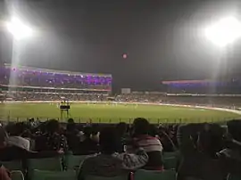 Day/night cricket, also known as floodlit cricket, is a cricket match that is played either totally or partially under floodlights in the evening. The first regular cricket to be played under floodlights occurred during World Series Cricket, unsanctioned by the International Cricket Council (ICC), attracting large crowds to see some of the world's best players compete in Australia and the West Indies. In 1979, when the ICC and World Series Cricket came to an understanding, the first floodlit One Day International was played, also in Australia. Floodlit cricket has since been played around the world, although England was slow to take it up due to their climate. Floodlit first-class cricket was first played in 1994, when the concept was tried during the Sheffield Shield.[1] Day/night cricket is now commonplace in one-day cricket and Twenty20 cricket. For instance, all 27 matches in the 2014 ICC World Twenty20 were day/night matches, as were most matches in the 2011 Cricket World Cup.