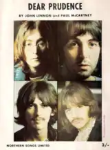 "Dear Prudence" is a song by the English rock band the Beatles from their 1968 double album The Beatles (also known as "the White Album"). The song was written by John Lennon and credited to the Lennon–McCartney partnership. Written in Rishikesh during the group's trip to India in early 1968, it was inspired by actress Mia Farrow's sister, Prudence Farrow, who became obsessive about meditating while practising with Maharishi Mahesh Yogi.[1] Her designated partners on the meditation course, Lennon and George Harrison, attempted to coax Farrow out of her seclusion, which led to Lennon writing the song.