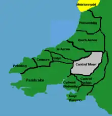 Deheubarth (Welsh pronunciation: [dɛˈhəɨbarθ]; lit. 'Right-hand Part', thus 'the South')[4] was a regional name for the realms of south Wales, particularly as opposed to Gwynedd (Latin: Venedotia). It is now used as a shorthand for the various realms united under the House of Dinefwr, but that Deheubarth itself was not considered a proper kingdom on the model of Gwynedd, Powys, or Dyfed[5] is shown by its rendering in Latin as dextralis pars or as Britonnes dexterales ("the Southern Britons") and not as a named land.[6] In the oldest British writers, Deheubarth was used for all of modern Wales to distinguish it from Hen Ogledd (Y Gogledd), the northern lands whence Cunedda originated.[7]
