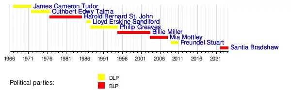 | 1 | James Cameron Tudor (1919–1995) | 30 November 1966 | 9 September 1971 | 4 years, 283 days | Democratic Labour Party | Errol Barrow | [2] | |||