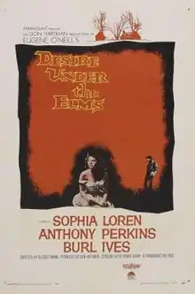 Desire Under the Elms is a 1958 American film version of the 1924 play Desire Under the Elms written by Eugene O'Neill. The film was directed by Delbert Mann from a screenplay by O'Neill and Irwin Shaw. The cast included Sophia Loren as Abbie (known as Anna in the film), Anthony Perkins as Eben, Burl Ives as Ephraim, Frank Overton as Simeon, and Pernell Roberts as Peter. The film was nominated for Best Black and White Cinematography (Daniel L. Fapp) at the Academy Awards and Laurel Awards in 1959. It was also entered into the 1958 Cannes Film Festival.[2]