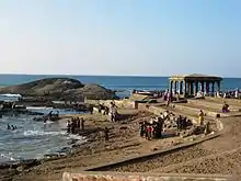 Red Sarees and Ghee wick lamps are offered to the goddess by devotees. Reciting Lalita Sahasranama while approaching and circumambulating the temple is considered auspicious.[4] The location Kanyakumari, i.e. the southern tip of India has been held sacred by Hindus' as it is the confluence of three seas. Offering Pitru Tarpana and bathing in the sea in the Kanyakumari beach is considered holy because it the convergence of many important Tirthas. There are a total of 11 Tirthas associated with the temple in the ocean surrounding Kanyakumari.