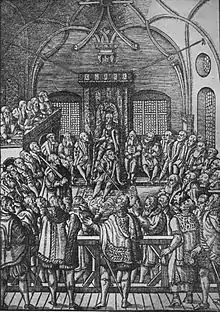 After the defeat of the Bohemian estates in the Battle of White Mountain, Ferdinand II would proclaim in 1627 for Bohemia and 1628 for Moravia the Renewed Regional Code, in which the monopoly position of the states was abolished in favour of the provincial government. Despite these limitations, the Diet and its committees, like the Diets in Austria, remained an effective means of political co-decision. In their meetings, usually once a year, the estates could, through the amount of taxes, resist the lords of the land. All direct and indirect taxes, with the exception of the collection of customs duties, remained within the competence of the estates.[3] The Diet was thus a relic of the estate power rather than an absolutist instrument and even by the 1830s, the diet was again a base for organizing the opposition and a place of political friction.[4]