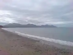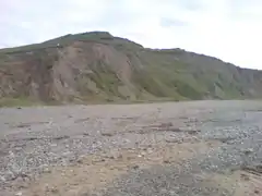 The cliff above the beach is known as Boncan Dinas and is occupied by an Iron Age hillfort, Dinas Dinlle. This fort has been eroded by the sea, such that only a double semi-circular rampart remains. Finds of Roman pottery suggest reoccupation in the 2nd or 3rd centuries CE.[2] The fort is about 164 yards from north to south by 120 yards with an entrance on the south west. It is possible that a Roman lighthouse originally stood here.[3] It is possible to make out small depressions which are thought to indicate the sites of Iron Age huts and the mound may be the remains of a barrow.[4]