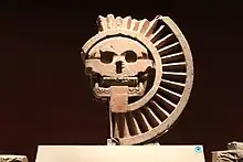The Disk of Mictlāntēcutli (Nahuatl: [mik.t͡ɬaːn.ˈteːkʷ.t͡ɬi] ⓘ), otherwise known as the Disk of Death, is a pre-Hispanic sculpture depicting Mictlāntēcutli, the Aztec god of death and ruler of Mictlān, the underworld of Aztec mythology.[1] Archaeologists found the artwork in Teotihuacan's Pyramid of the Sun in 1963. The basaltic rock disk is partly destroyed. The sculpture features a skull with the tongue out and is surrounded by a pleated paper headdress.