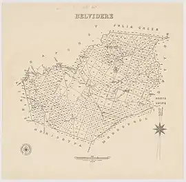The settlement at Belvidere may have been a consequence of the opening of Belvidere Mine,[3] a marble mine adjacent to a crossing of the River Light (now McCarthy Bridge) and was likely named Belvidere by association to either the Hundred of Belvidere, the land administration division on the south east side of the river crossing in which the main settlement lay, or the Belvidere Range which overlooks the mine and west of the hundred.