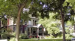 The East Grove Street District is a residential historic district located on the 400 through 700 blocks of East Grove Street in Bloomington, Illinois. The district includes 43 houses and apartment buildings, 25 of which are considered contributing buildings. The houses in the district were built between 1855 and 1915 for many of Bloomington's upper middle class residents. Due to a building boom between 1880 and 1900, the then-popular Queen Anne style is the most prevalent in the district. Other popular architectural styles in the district include Greek Revival homes from the 1850s, Italianate homes built between 1860 and 1880, and Arts and Crafts homes built in the 1900s.[2]