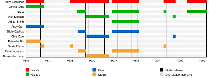 Due to musical differences, the Skunkworks line-up disbanded at the supporting tour's conclusion.[16] After a short period of inactivity, Dickinson once again teamed up with Roy Z to record his next album, 1997's Accident of Birth,[17] which also featured Balls to Picasso contributors and Tribe of Gypsies members Eddie Casillas and Dave Ingraham.[18] Former Iron Maiden guitarist Adrian Smith was asked to guest but remained as a full-time member.[19][20] The line-up stayed intact for a further studio album, 1998's The Chemical Wedding,[21] before Dickinson and Smith rejoined Iron Maiden in 1999.[22] Although Z was unable to take part in The Chemical Wedding's supporting tour (his replacement was guitar technician Richard Carette),[23] he did take part in the 1999 live album, Scream for Me Brazil.[24]