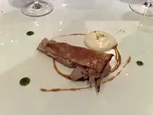 When diners first arrive, they are given a selection of small bites from a section of the kitchen called "El Món", who only produce small snack portions for the guests. They typically demonstrate flavours from around the world and come in sets of five. These introduce the diner to the unusual techniques and presentations of the restaurants. For example, a small ball of frozen spiced fish stock coated in cocoa butter represents Thailand, while the set comes on a purpose-built wooden holder.[13] While there are typical fine dining ingredients included on the menu such as lobster and foie gras, due to the Catalan influence on the menu, ingredients such as pigeon, hake and pig's trotters also appear.[14] Fish dishes include a crayfish velouté, accompanied by spring onions with cocoa and mint.[15]