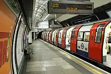 The multi-coloured platform tiles on the Northern line were reconstructed in the 1920s in conjunction with an extension to Morden station.[12] The tiles were carefully replicated in 2006 to replace the originals, which were in poor condition.[12] The original C&SLR tiles dating from 1890 remain on the tunnel roofs of the Northern line platforms, albeit now covered over by the new cable-management system.[12][note 4] The station was refurbished in 2007.[25] The original maroon and cream tiling on the Bakerloo line platforms has been covered over.[25] Because of the arrangement of the lighting, cabling and public address loudspeakers, it was not possible to arrange the new roundels at alternate 'low' and 'high' positions, all being at the lower level.[12][25][26][note 5]