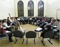 Today, EUSP maintains a good relationship with different levels of government and administration, as evidenced among other things by a visit and meeting of the Russian Minister for Education and Science Andrei Fursenko[16] with the faculty and students at EUSP on 4 June 2009 and by the address by deputy governor of Saint Petersburg Mikhail Oseevsky[17][18] at the opening of the academic year ceremony on 7 September 2009.