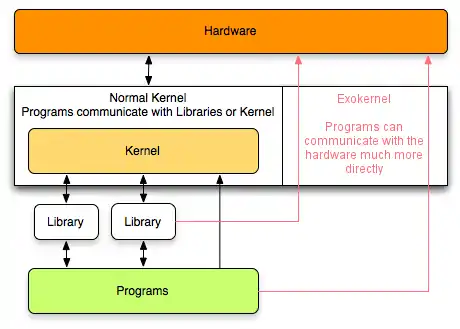Graphic overview of Exokernel. Exokernels are much smaller than a normal kernel (monolithic kernel). They give more direct access to the hardware, thus removing most abstractions