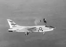 A key feature of the F-8 was its variable-incidence wing, which allowed for a greater angle of attack to be achieved and increased lift without compromising forward visibility by pivoted by 7° out of the fuselage during takeoff and landing runs.[3][6] Simultaneously, the aircraft's lift was augmented by leading-edge flaps drooping by 25° and inboard flaps extending to 30°. The F-8 also took advantage of contemporary aerodynamic innovations such as an area-ruled fuselage, all-moving stabilators, dog-tooth notching at the wing folds for improved yaw stability, and liberal use of titanium throughout the airframe.[3] The aircraft was powered by a single Pratt & Whitney J57 turbojet engine, which was equipped with an afterburner. On the initial F8U-1 production aircraft, this afterburner increased the engine's thrust from 10,200 lb to 16,000 lb, but, unlike later engines, lacked any intermediate thrust settings.