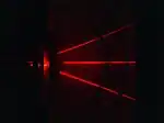 The image on the right shows a laser beam diffracted by a grating into n = 0, and ±1 beams. The angles of the first order beams are about 20°; if we assume the wavelength of the laser beam is 600 nm, we can infer that the grating spacing is about 1.8 μm.