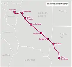 The San Cristóbal to Tucumán Railway (in Spanish: Ferrocarril San Cristóbal a Tucumán) was a French-owned railway company founded in 1888 which built a 1,000 mm (3 ft 3+38 in) metre gauge railway from San Cristóbal to Tucumán in Argentina.