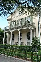 • Mayor Isaac W. Patton House, 1527 Washington Avenue, described in 1859 as "a handsome cottage residence," this Greek Revival house was erected for Lothrop Lewis Smith who purchased the site in 1853. It was his residence until he left New Orleans in 1859 and sold the house in 1861 to Mrs. Adolphe Jerome Odier. From 1873 until his death in 1890, it was the home of Isaac W. Patton, mayor of the City of New Orleans, 1878–1880. The entire square was sold in 1832 to H.W. Hills and William Lord Roberson by Matthew Morgan, Samuel J. Peters, Levi Peirce and William H. Chase, who in that year subdivided the Livaudais Plantation as Faubourg Livaudais, a part of the city of Lafayette that was annexed to the city of New Orleans in 1852. (Marker by New Orleans Landmarks Commission, 1985)[25]