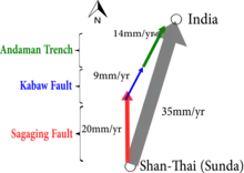 The 20mm/yr dextral (right lateral) strike slip Sagaing Fault detaches the Burma microplate from the Sunda plate.[21] The arc-parallel fault spans over 1400 km in a north-south direction, remarkably linear for the central 700 km (at 17°N to 23°N latitude) and forms a slight arc shape swinging N10°E and N170°E direction at the north and south ends of the fault respectively.[21] Northward, the Sagaing fault terminates at the Jade Mine belt (~ 24.5°N) and splays into a 200 km width compressive horsetail structure.[21] Southward, it is connected to the active Andaman spreading rift.[21] The onset of seafloor spreading on the Andaman rift puts a minimum 4.5 Ma age constraint on the Sagaing Fault.[22]