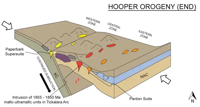 Enhanced partial melting, as a result of further subduction during the later stages of the Hooper Orogeny, produced widespread mafic and ultramafic intrusions in the Central Zone, with intrusions of the Paperbark Supersuite in the Western Zone, and the intrusions of the Panton Suite in the Eastern Zone.[10]
