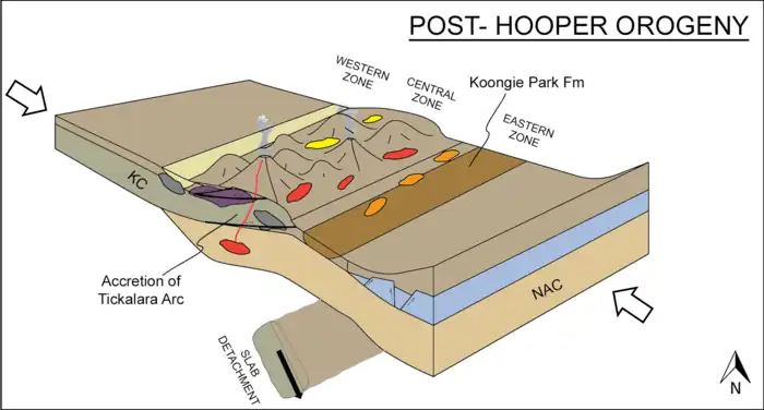 After the Hooper Orogeny, the downgoing slab, which had been deeply subducted into the asthenosphere, detached from the surface portion of the tectonic plate. The resulting change in isostasy temporarily buoyed the thinned-out Kimberley Craton section above the North Australian Craton, leading to the formation of the accretionary wedge of the Tickalara Arc, and setting the stage for the later suturing of the Kimberley Craton and North Australian Craton.[2]